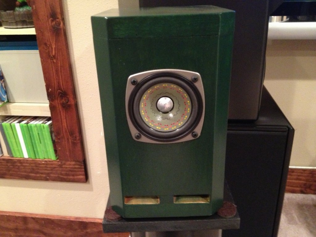 Finally got around to finishing these for my littles bedroom. I need to break then in some. Right off the play the sound stage is deep, imaging is spit on, depth of stage is there too. They may get to a 100 F3, maybe lower. Dave can tell us if he measured it. I will paint the vents later. Hand wiped Minwax green dye with a semi gloss oil bases clear.