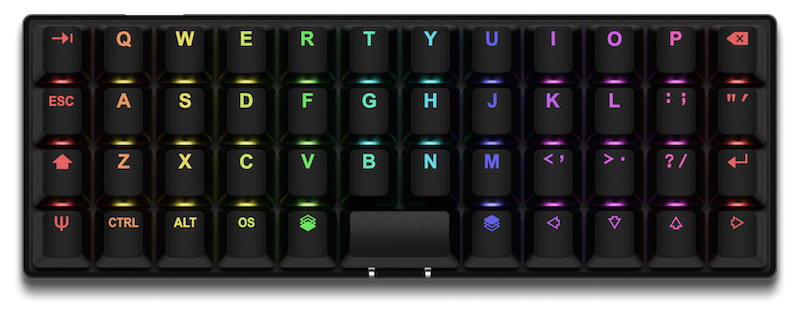 The key layout is ortholinear - the more I tried to improve my typing, the more the conventional "staggered" layout annoyed me. Also, you can just swap out the keyswitches for a different set if you want. And also, it has individual backlighting for each key, which can be used as a mnemonic for the active keys in each layer. (Seriously, the image below makes it look like a gimmick but it doesn't have to be used that way.)