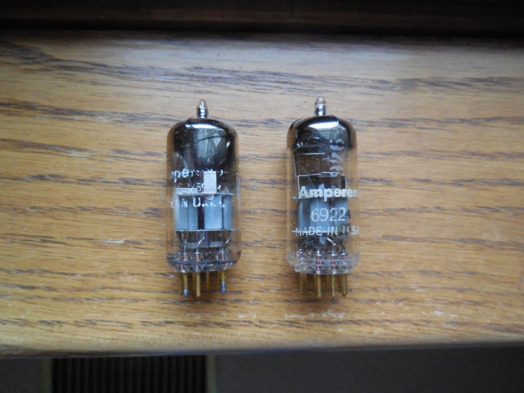 A pair of AMPEREX 6922 PQ D-getters.Manufactured in the USA 1959.Tested 97/98 and 98/96 on a Hickok 6000A tube tester.