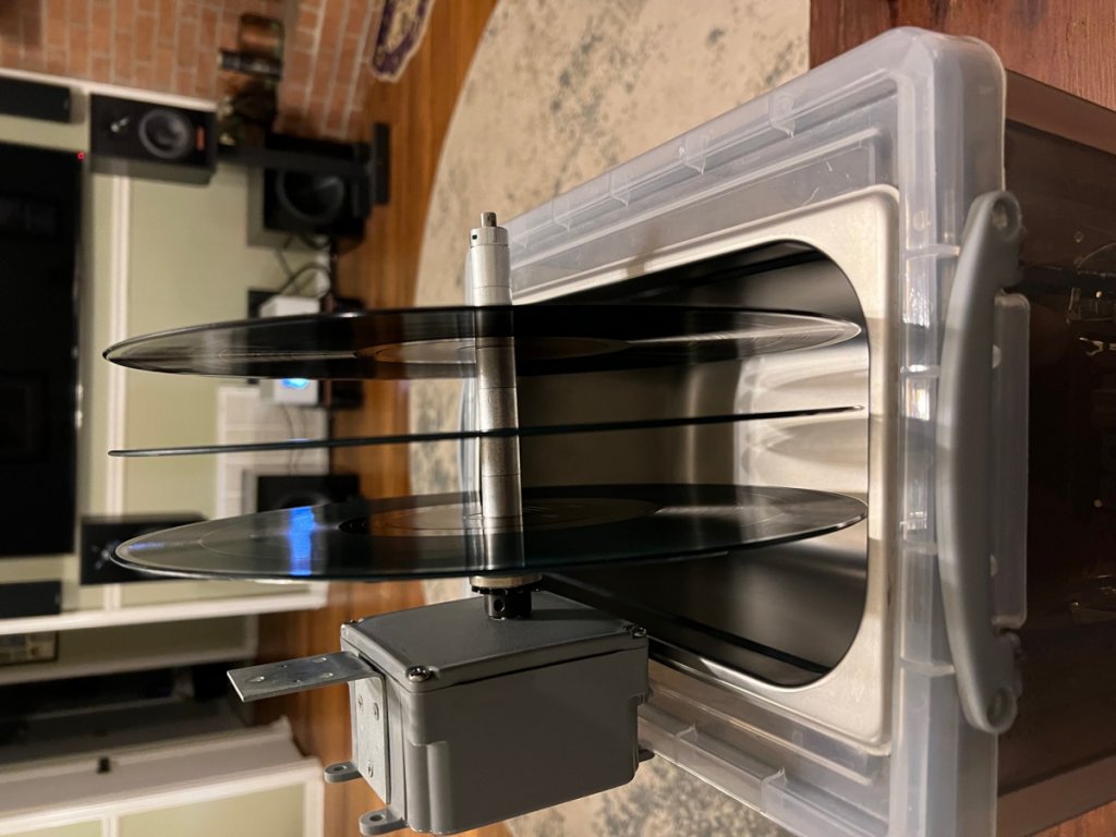 This is my DIY ultrasonic record cleaning machine. It is based off of a Vibrato LLC ultrasonic unit using four 60 kHz transducers attached to a 6L stainless steel pan.