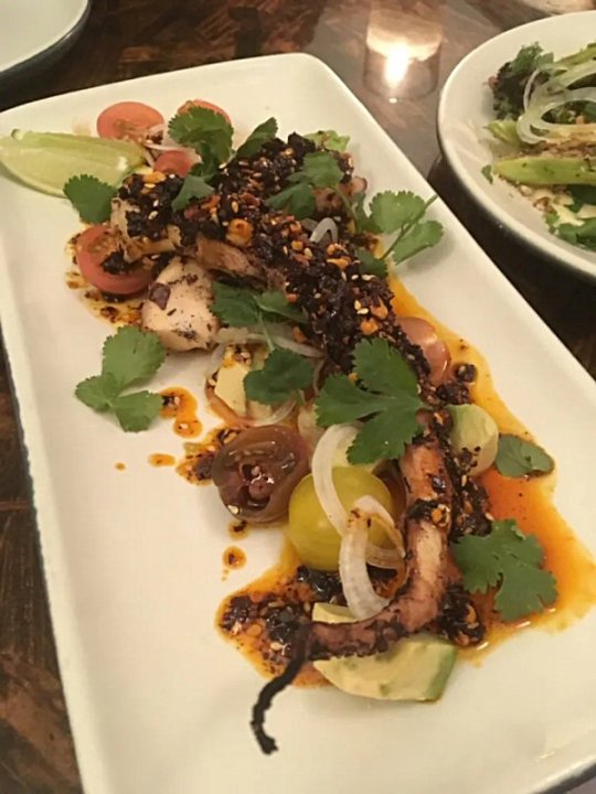 Dinner was grilled octopus with salsa macha, avacado, tomato, red onion, lime. My friend had the grilled Baja striped bass. Dessert was the dark chocolate ganache with dulce de leche, candied orange, toasted almond, maldon, lightly sweetened whipped cream.