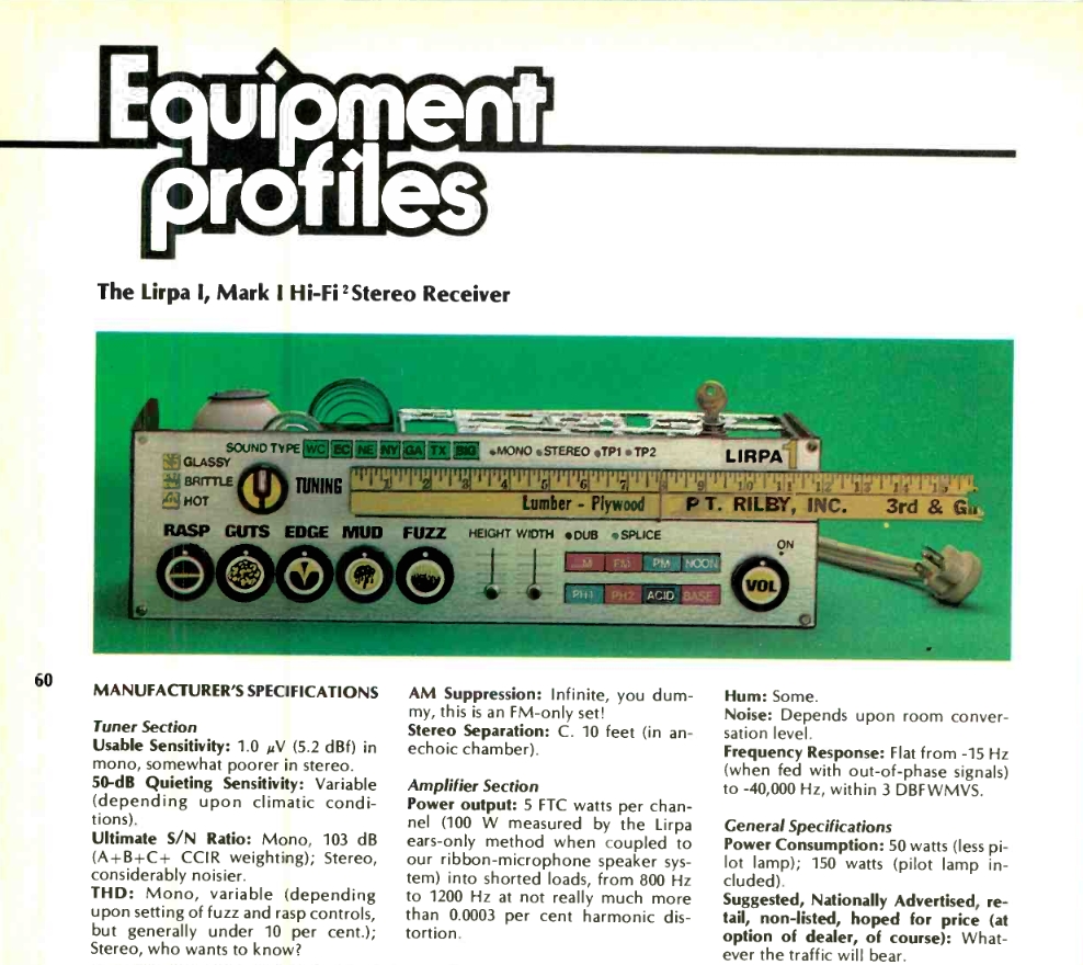 I have always lusted after Professor Loof Lirpa's first product, the Lirpa 1, Mark 1 receiver. This forward thinking receiver has everything an audiophile would ever need or desire (and some things an audiophile would never need or desire) which makes it a perfect fit for everyone. The receiver has a classic tube sound with innovative tone controls that lets the user adjust the sound to their preference, not the designer's or recording artist. The Glassy, Brittle and Hot push buttons would finally make my Windham Hill album collection listenable.