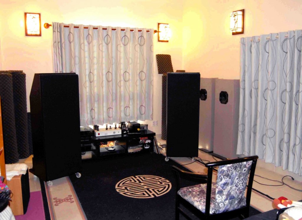 Hi Guy. Well, you know what the old Quads ("57's") look like, right? Electrostatic panels 29" tall by about 34" wide, and varying in depth from a couple of inches at the top to about eight inches at the bottom. To stack them, people usually have the bottom pair near the floor and the top pair centered at ear level (that's how Mark Levinson made the stands for his HQD, acronym for Hartley-subs/Quad-mids/Decca-ribbon tweeters). I, instead, mounted the bottom pair at ear level and the top pair at standing ear level (I don't like looking down at the image, and often get up to dance or, uh, play air guitar). The stands are mounted on the sides of the Quads, one 3-layer MDF panel (2.25") six inches deep/wide on each side of each speaker until reaching about five inches above the floor, where the MDF makes a right angle front and back to form the two foot deep (or wide, if you're looking from the side) feet/legs. The panels (four, one on each side of left and right pairs) are all separate, with a 3/4" thick/six inch deep MDF brace below, between, and above the two speakers on each side, dado'd into the side panels, bolts passing through small holes in the side panels and into the braces, and the side of each Quad bolted onto each side panel. Once they are assembled, they CANNOT be moved, spikes or no spikes!