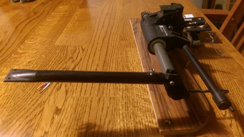 One of the most affordable and well thought out linear tracking air bearing tone arms produced. This arm is in excellent shape, and comes with the large gauge for setting the VTA on the fly lever. Has had cartridge clips replaced with Cardas clips. These are the easiest to get on and off a cartridge, and are trouble free. Comes with the factory air pump.