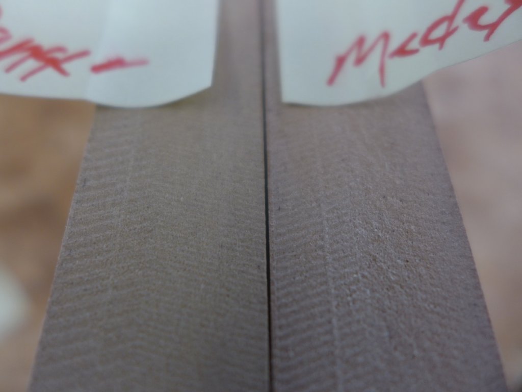 Both look like MDF. I didn’t taste them. The Medex looks slightly more granular, but I might attribute that to differing color of particles. Whereas the Ranger Board looks finer and more homogenous in color. If forced to choose which looked more attractive, I’d have to give the nod to Medex. Its warm brownish tone ultimately more appealing than the yellowish pallor of Ranger Board. The Medex has a more prominent “grain” on surface. I assume from sanding at factory.