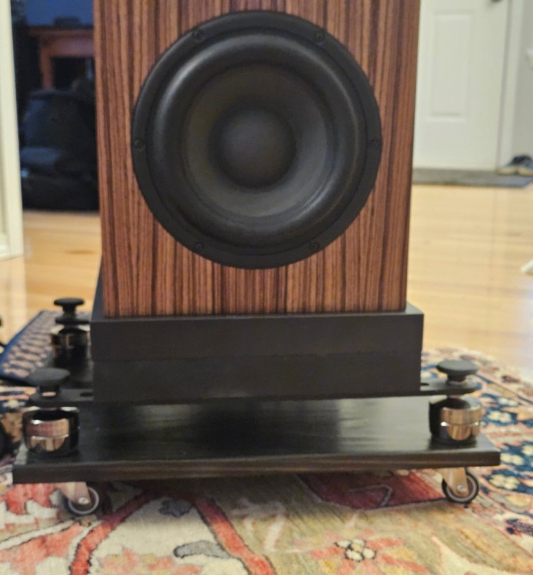 (I have a similar 'stack' approach with my mains sitting on top of subs utilizing opposed 8" Rythmik drivers. In my case, Robert Herbelin recommended five Big Fat Dots to separate them, though I admit that I'd prefer the look of a smaller reveal as enabled by thinner Dots than my 1/4" Fat Dots. I replaced my Herbie's sliders with another product, but like you, I was amazed at the difference obtained by isolating the stack from my suspended wood floor.)