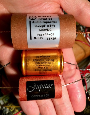 Received Miflex KPCU 0.22 uF 600V caps, and right off the bat, there are two HUGE problems:1: Miflex is gigantic compared to other 0.22 uF caps, much larger than Jupiter Copper or VH CuTF, larger than Duelund CAST. It will not fit where I intended to place them 2. To make matters worse, Miflex is radial design, which makes it even more difficult to fit in many places designed for axial caps.Sonic Craft does not allow returns on passive components (which I understand for a small company), so I am looking for someone who may want to trade a pair of used Jupiter copper 0.22 uF/600V with my brand new pair of Miflex 0.22 uF/600V caps. I can throw in a pair of some other caps (like a nice pair of Vishay Roederstein MKP-1839 bypass caps or something). MiflexJupiter by drjlo2, on Flickr
