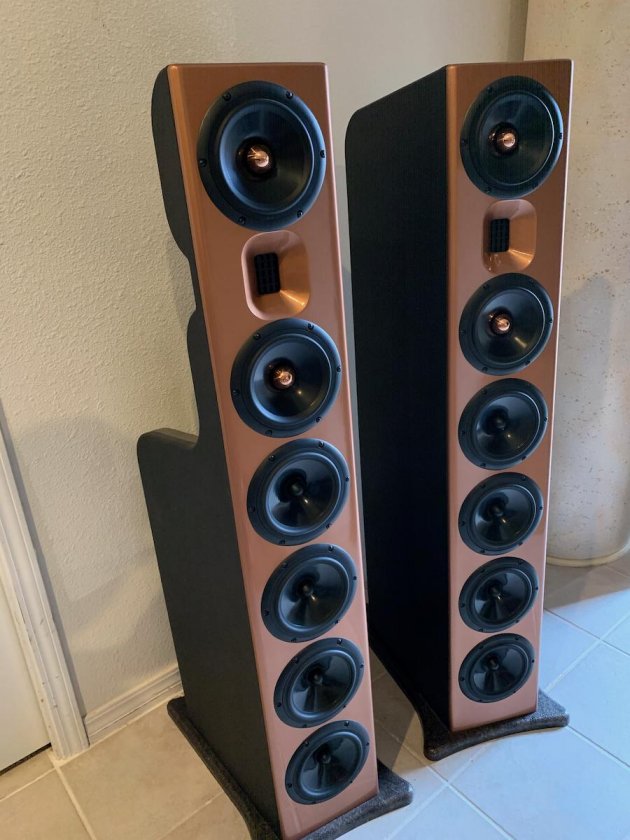 Visually however, this is a beautiful speaker - the copper baffle really sets off the copper phase plug on the midrange drivers. The crazy thing is Danny said he was able to get this finish/look out of a can of spray paint!