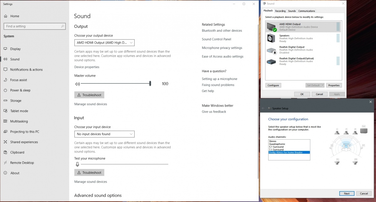 If the Dolby Atmos setting doesn't stick then Windows is not yet communication with the surround processor. (1) Turn everything off, (2) turn on processor and TV, (3) reboot computer so Windows has a fresh start and try again. I don't know if earlier Windows versions work, version 1909 is the latest and so far very stable and fast, boot times and speed is not effected. 1909 is a manual update, Windows no longer does automatic version updates, go to Settings --> Update and Security. 1909 is big and does a lot of housekeeping during the install, allow 12 hours or overnight. During the install Windows may look like is frozen, stalls at 37%, hangs at a restart screen or other such nonsense, don't freak out, let it do it's thing which is why overnight is best, that way you are not hovering, worrying and checking the progress.