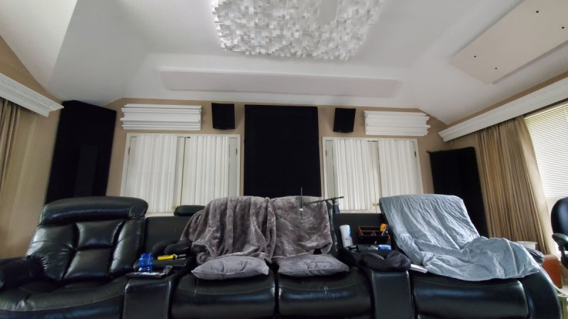 All of the diffusor panels (mostly PI Audio Group) have a few layers of paint, except for the skyline diffusors (Vicoustic) directly above the listening position.