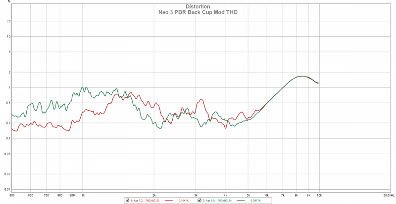 Here's the most promising results by far. The Neo3W with the cup mod gives a fantastic response in both frequency and THD..