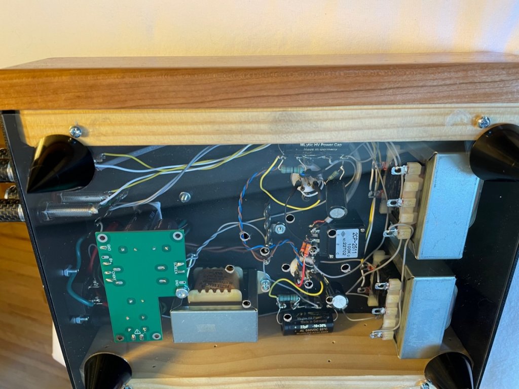 I made few upgrades that made sense to me. I replaced the binding plates and RCAs with better quality ones. The sockets are gold plated copper Teflon. I also replaced the resistors with Takman and cathode decoupling capacitors with Elna Cerafine and the screen grid decoupling cap with Mundorf Mlytic HV.