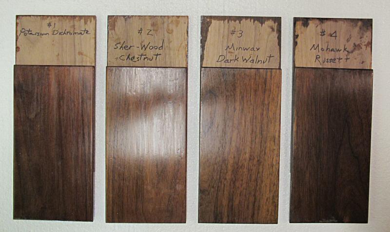 Walnut can also be darkened before staining with a mix of potassium dichromate in distilled water, about 1/2 tsp to 2 cups hot water. The mix is a strong oxidizer. Sand lightly after it dries because the water raised the grain.