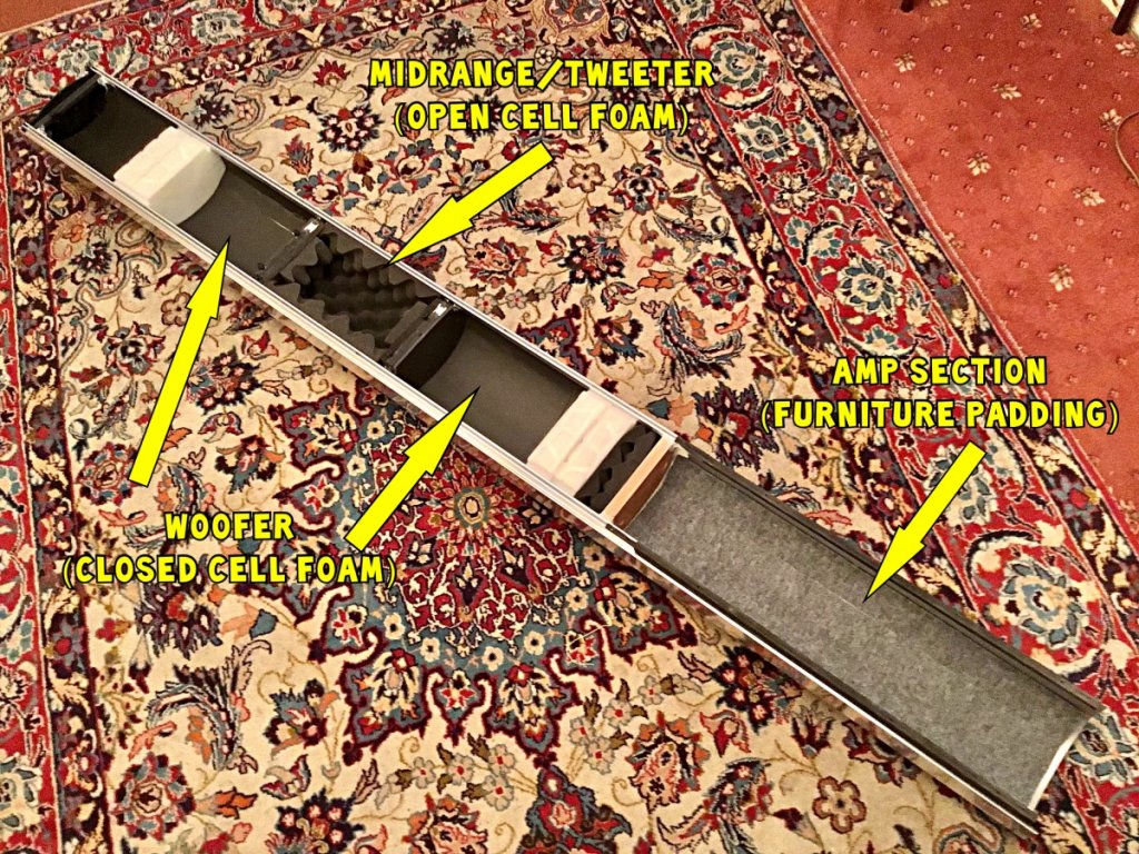 Bass waves are absorbed by ‘Open Cell Foam’ (which is a bad thing!). Instead you should use ‘Closed Cell Foam’ which does not absorb bass waves, but instead redirects them. However, even though a thin layer of Closed Cell Foam does slightly reduce the space/volume inside the cabinet, it does still have some ability to absorb/muffle any stray midrange information coming out of the rear side of the woofer.