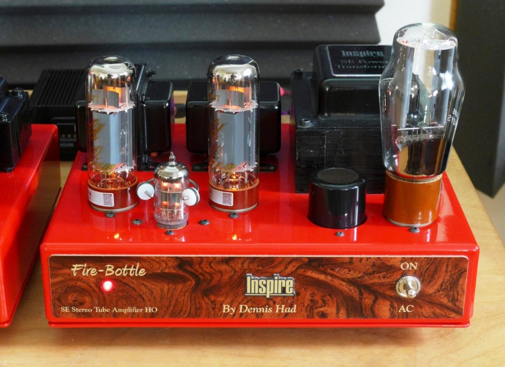 Amplifier - Inspire KT-150 single ended pentode in the same Jaguar Carnival Red.  Will output between 5 and 12 wpc depending on tubes chosen.  You can run any of dozens of power tubes and signal tubes.  Sent back to Dennis in 2016 and had $350 upgrade, which included: