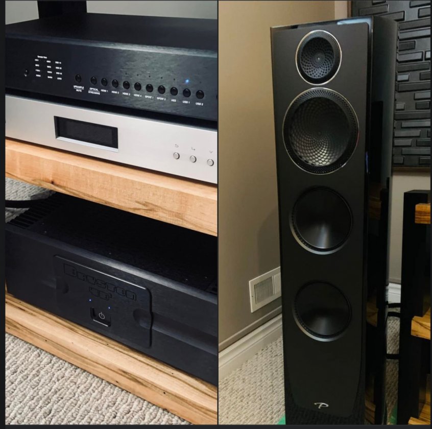 A 2.1 bedroom system driving a pair of Dynaudio Excite X12 white piano lacquer speakers and a Velodyne Digital Drive DD-12 servo active subwoofer