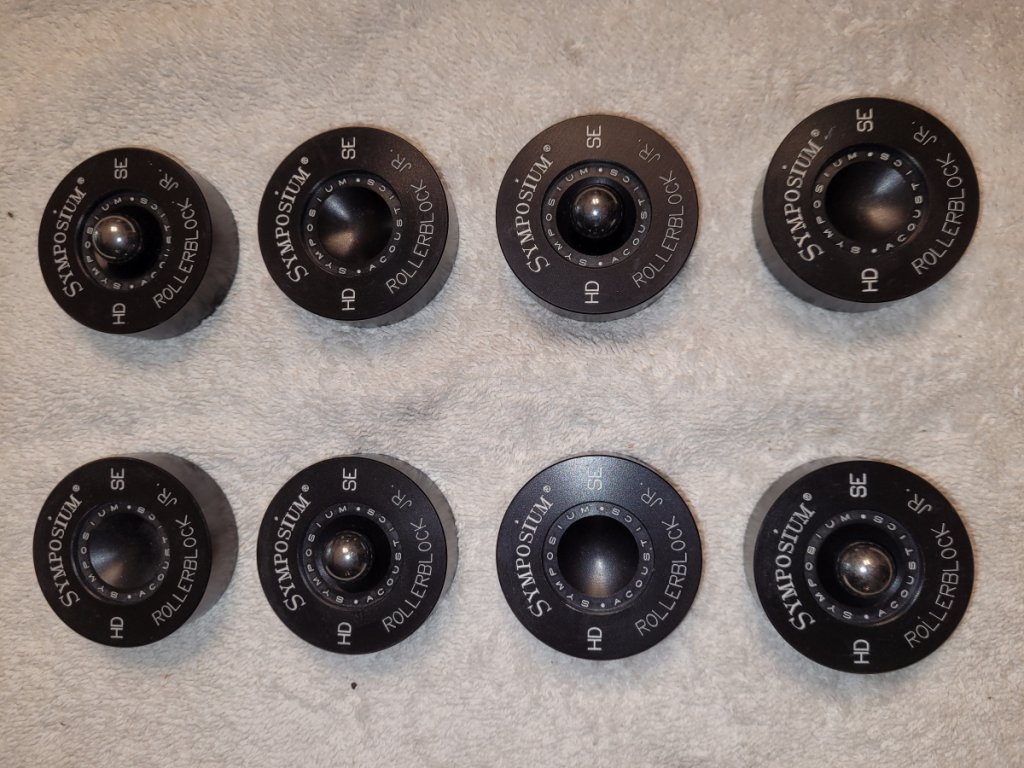 $0LD!!!Up for grabs are two sets of Symposium Acoustics RollerBlock Jr. HD-SE version. Each set includes eight (four upper & four lower bodies) and four, 1/2" Grade "10" Tungsten Carbide balls. These are considerably better than the standard Roller Block Jrs. I am liquidating these due to the dismantling of my second system due to a new home purchase and subsequent move...