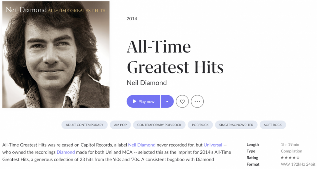 This song is from Gordon Lightfoot’s Sundown album. It’s a 24/192 file and while this album has quite a few jewels on it, I had never heard this simple, well written, well played song before. This song features quite a few nicely arranged instruments and of course, Gordon telling a great story from his touring days. So many nuances to pick out and enjoy. There is one harmonic sound that rings at about 11 sec and throughout the song. Every time my system steps up I hear it better and better. The percussion is perfectly balanced and the playing fits the song so well. Great players playing some easy music to listen to. What a great opener to start any listening session.