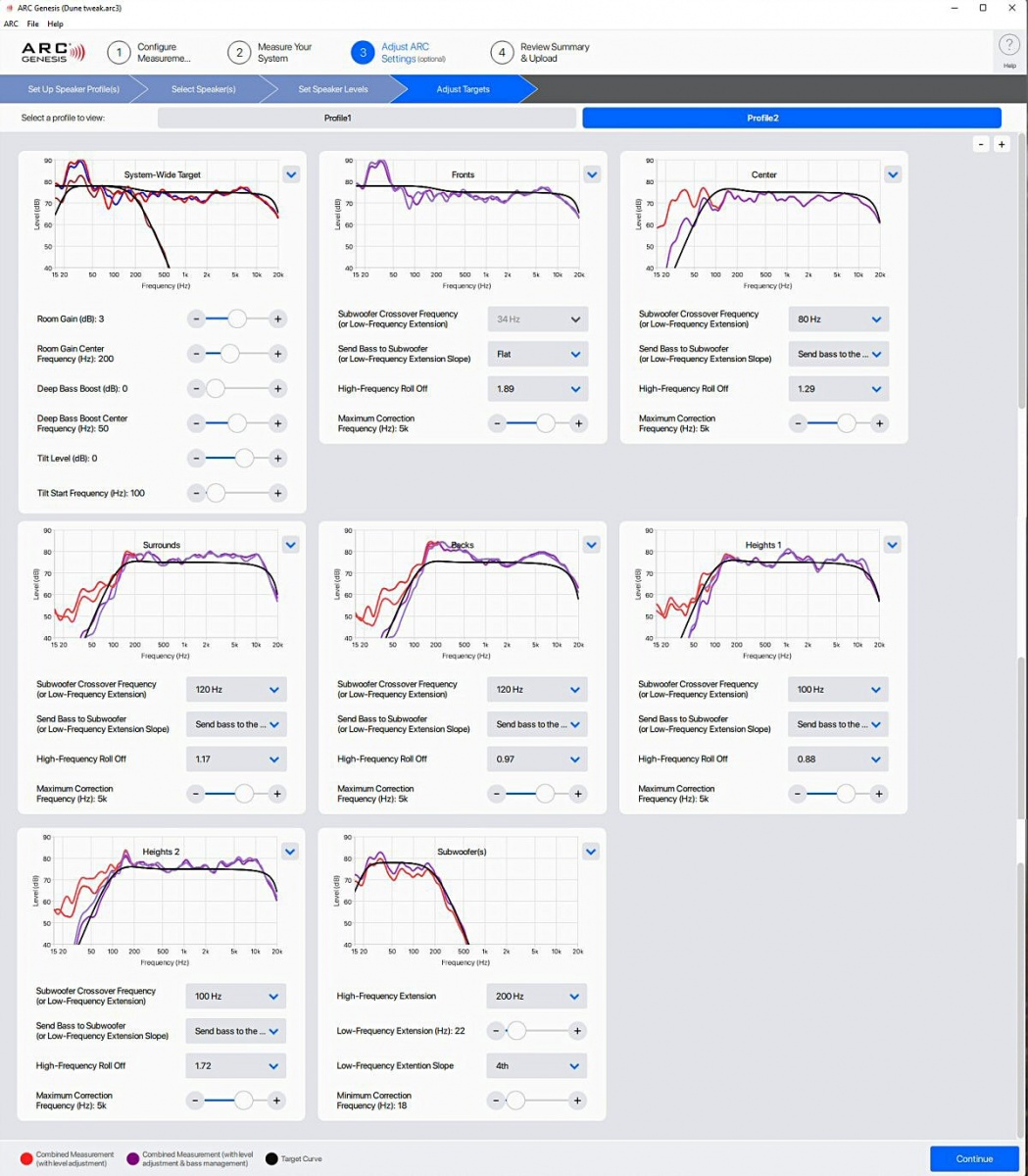 The Anthem ARC room correction fine tunes each speaker to sound more alike resulting in an immersive experience without one speaker overpowering the others. I always fine tune the frequency response and loudness after calibration, the software gets the sound close but human ears are the best. The Anthem ARC software is very versatile.
