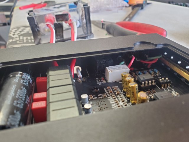 Next up, when you disassemble, the ground speaker terminal is just a solder filled cutout, and the GR Research solid core wire does fit in for the positive, but barely.