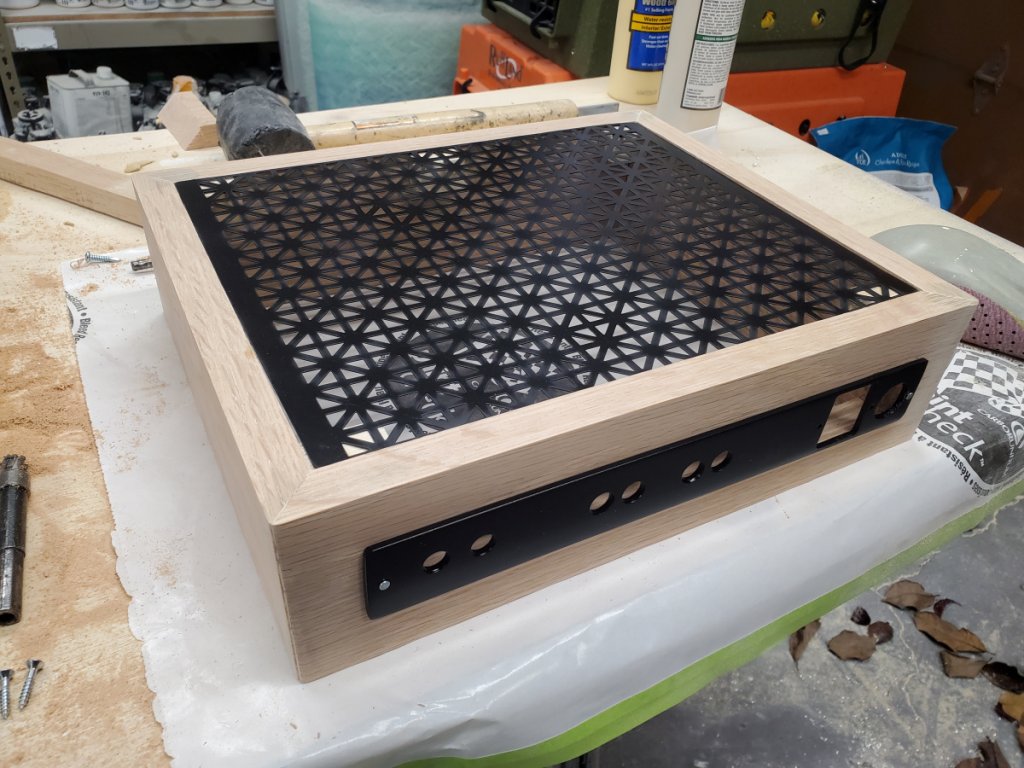 Was a little slower progress than I wanted, but case is built. Still need to stain it nicely, but it'll be good. I did find an aluminum sheet in the garage from an old Hammond chassis that I used for the bottom base. The open lattice should be nice for ventilation. Tomorrow and Monday will be a little tied up so likely won't bust out soldering iron til mid-week. You know I'll report back as soon as it's up and running.