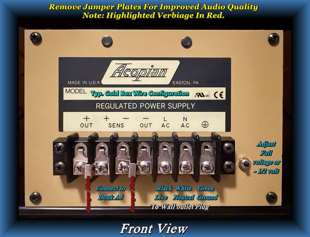 If someone decides to upgrade their power supply, using Acopian LPS Gold Box models, here are some connectors and cable options, my friends and I have used with success. Connectors for amp shown here $17 plus tax on Amazon. They have the simple option of using either banana plugs, or soldering wire directly to them.