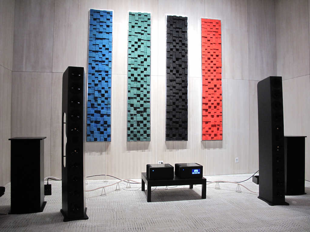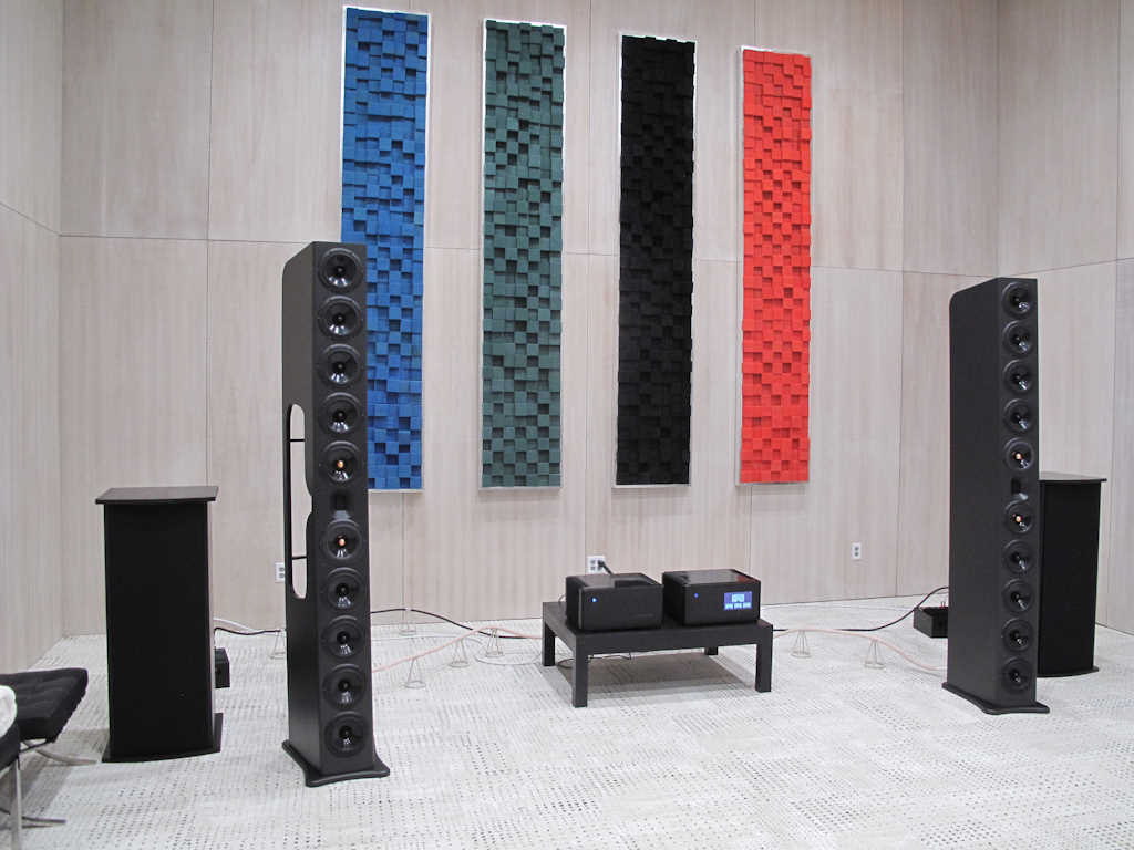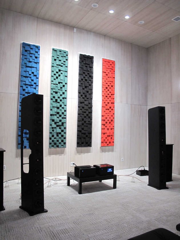 Now more photos. Tom’s custom-built listening room features 16 foot (4.9 meter) ceilings, and custom panel absorbers on the side walls and colorful absorber/diffusers on the front wall. The walls are bleached and stained cabinet veneer plywood mounted with compliant hangers over insulated studs built isolated room-in-a-room style.