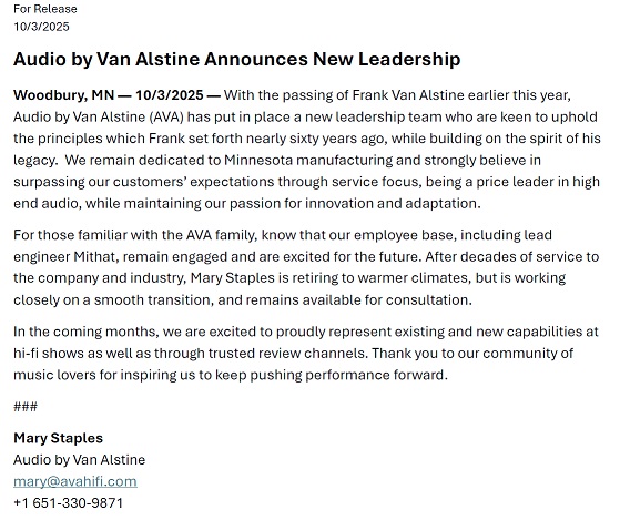 I’m incredibly proud of the new leadership team we’ve put in place. They bring fresh energy and a clear vision that I believe will take AVA to the level it truly deserves. There are exciting things ahead for Audio by Van Alstine, and I look forward to watching and supporting from a different vantage point.