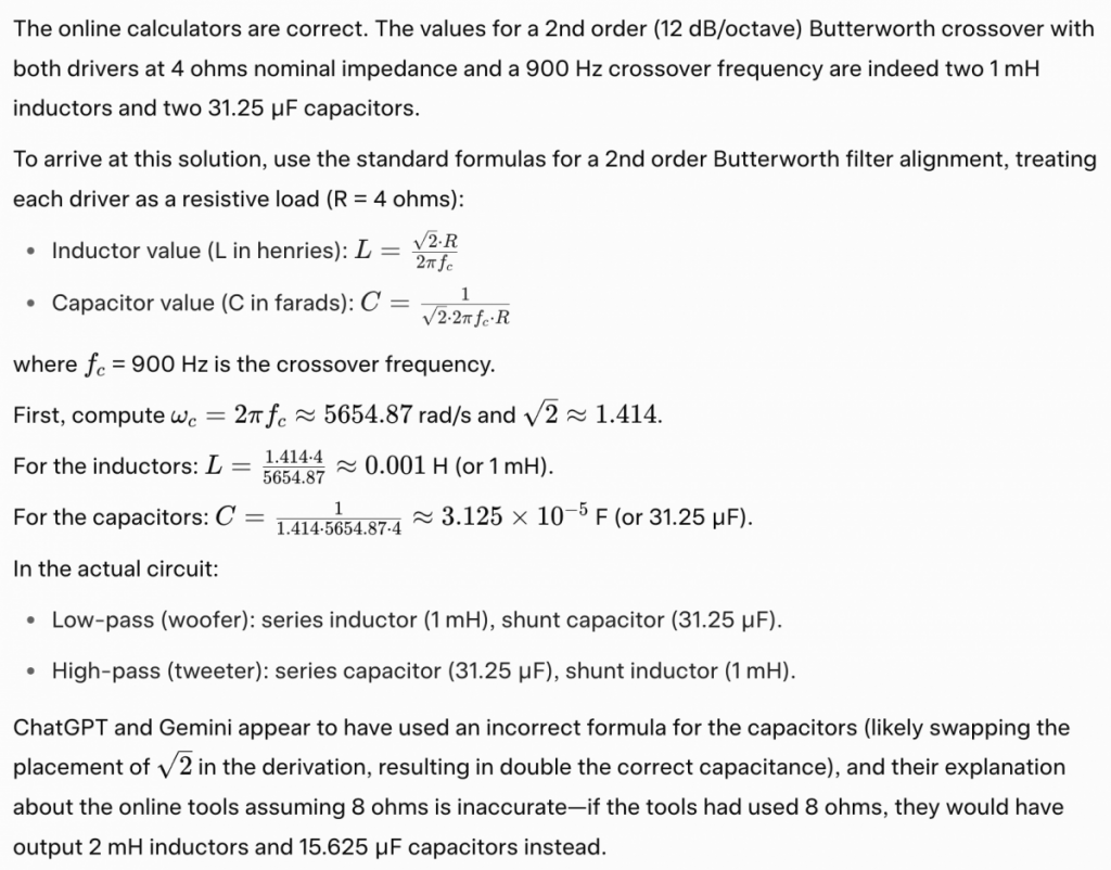 When asked why they disagree with the online calculators they say it's because the online calculators are using 8 ohms instead of 4 ohms for the drivers.