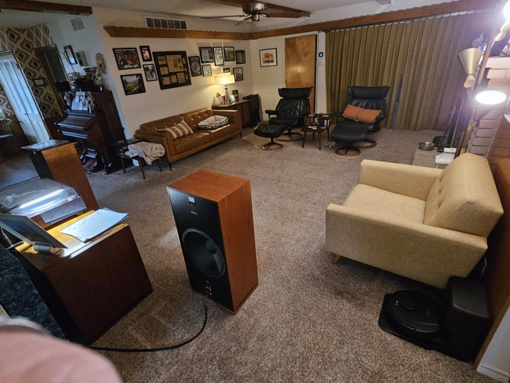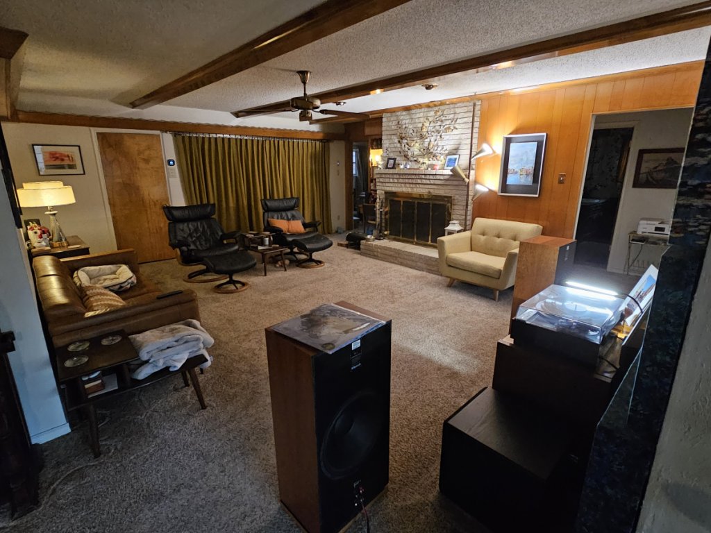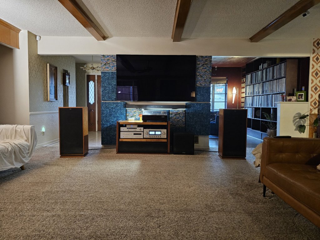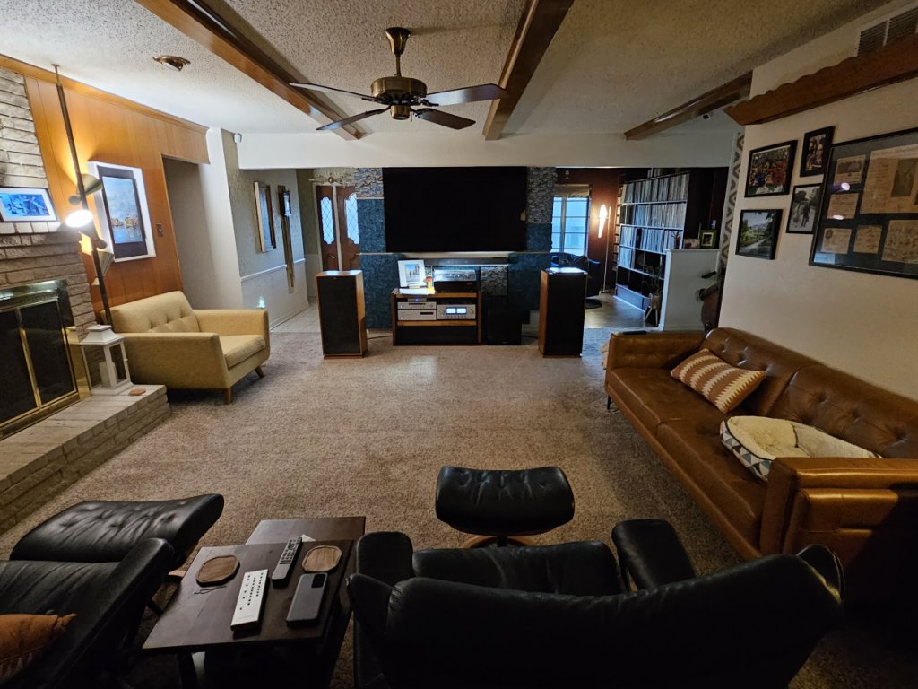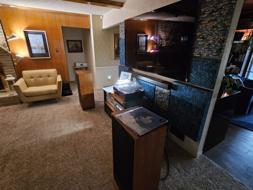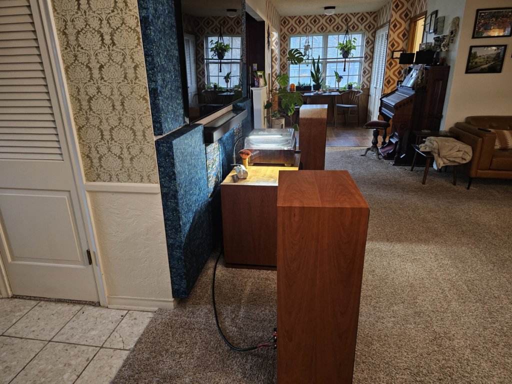 I have a smaller home with a large central living area at its center. My system is positioned against an 8’ wall with an entryway behind it to the left and a dinning room behind it to the right. There are also no traditional corners to the left or the right as they lead to other room in each direction. (You can see all of this in the pics below). I’m thinking (you tell me) this gives me some advantages and disadvantages. Advantage that I can hang my speakers out a little bit and cut down on the reflections from my 8’wall. Disadvantage that I can only separate them out 8’ without being in the way of egress around my house. You can see I added acoustic panels behind the stereo, speakers and to the left and right of the TV. This is because I was getting a lot of reverberation from the sub off the TV’s soundbar back down on my turntable. The panels are 4” deep behind the stereo and speakers and only 2” to the sides of the TV. This cut down the bass significantly. It also shrunk my sound stage. My theory is that I’ve cut down on the reflections I was getting off the wall that I mistook as imaging and now I’m just hearing my speakers (and their limitations). This has led me to looking into my next set of speakers…