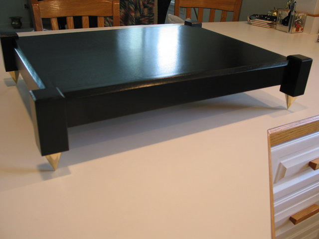 These stands are 19 x 16 x 4 1/2 tall and are dark cherry finished They are priced at 150.00 plus shipping as the basic stand in the size pictured and available in the dark cherry finish as pictured,natural clear and black for the same basic price. I can build other sizes to your specs if desired. I have recently added some different options that consist of a added removable bottom that covers a cavity between top shelf and removable bottom that sand,lead shot or other damping material may be added to really add some heft and real damping characteristics so the stand. I have also added black as a optional color due to overwhelming response for that color. I can also build other sizes to your specs if desired. Please feel free to ask any questions.