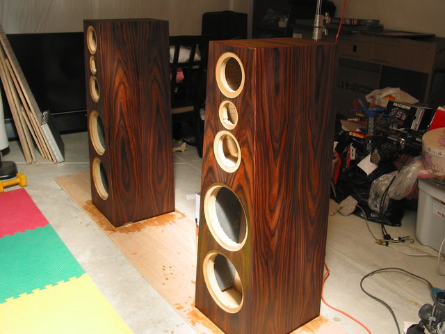 I used Pau Ferro for the veneer and topcoated the speakers with a gloss wiping varnish.  The plinths are made from 3 cm black granite.  I pretrimmed the front baffle edges of the speaker with Moradillo hardwood (which I think is Bolivian Rosewood - the same as Pau Ferro) that closely matched the Pau Ferro veneer I bought.  Once I veneered the speakers I was then able to route the front edges back (I used a 1/4" roundover) and achieve a very nice and nearly seemless roundover of the hardwood with the veneer.